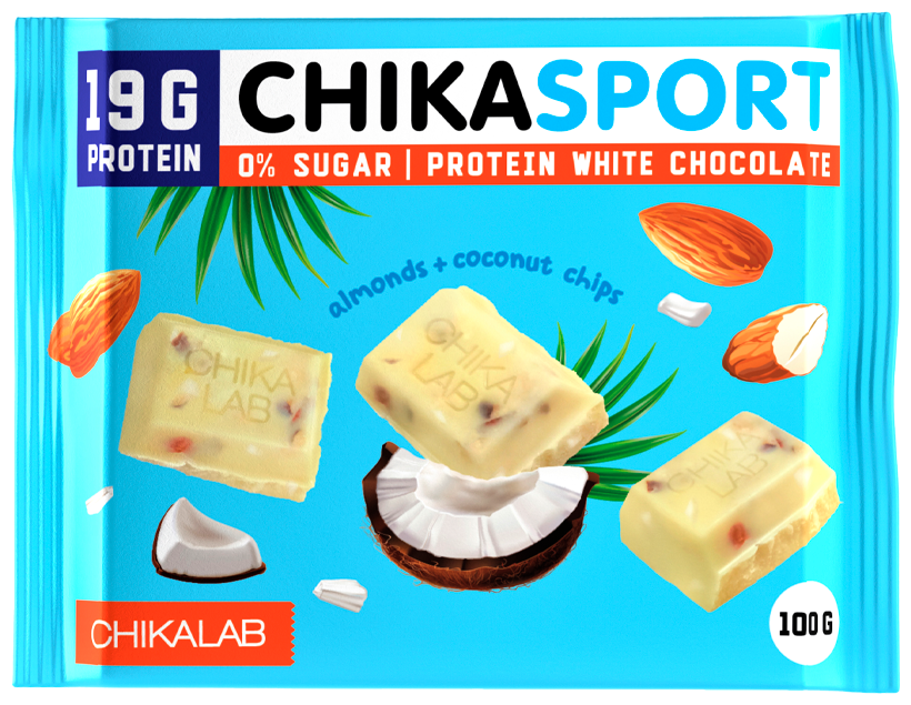 Chikalab Шоколад белый с миндалем и кокосовыми чипсами, 100 грамм